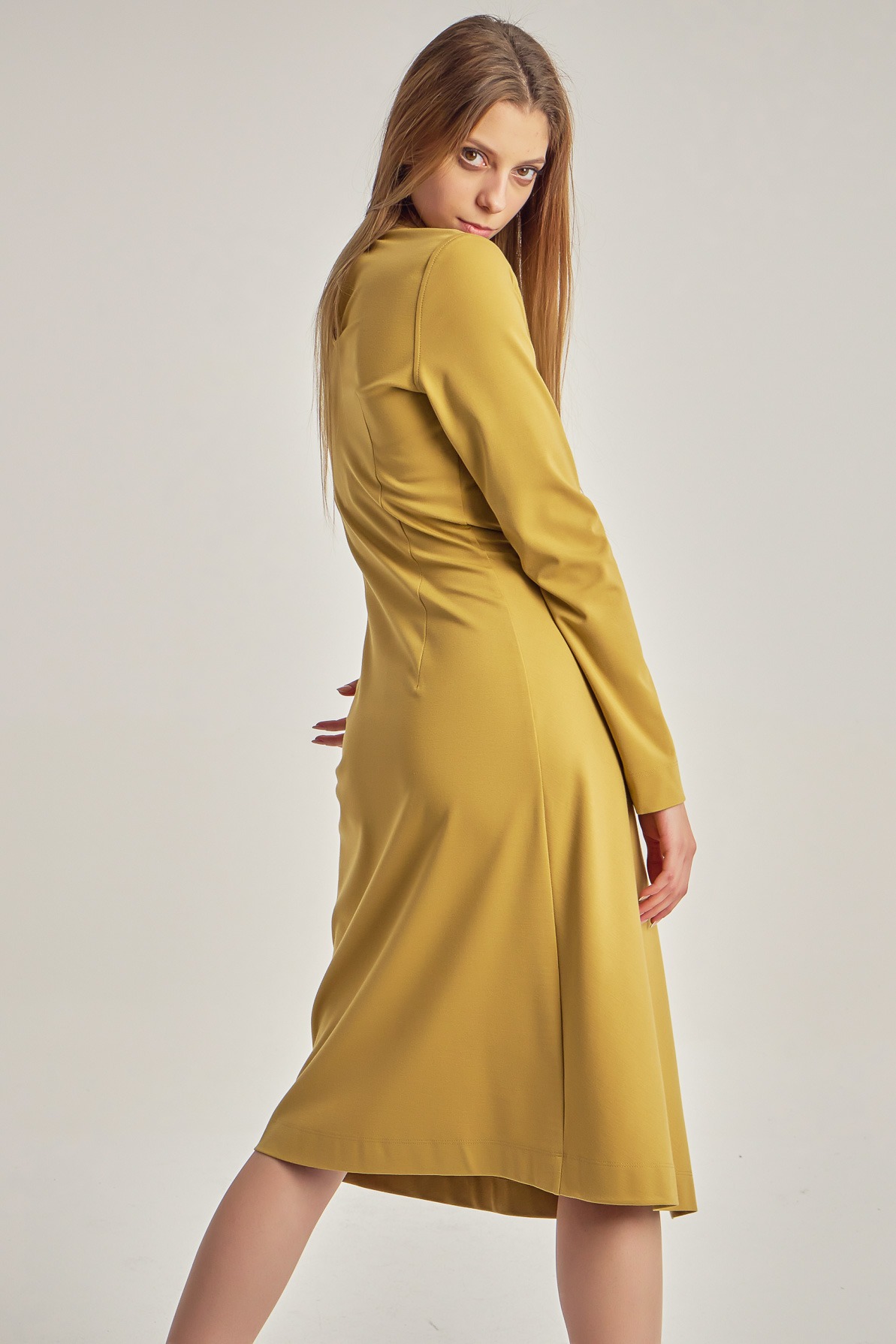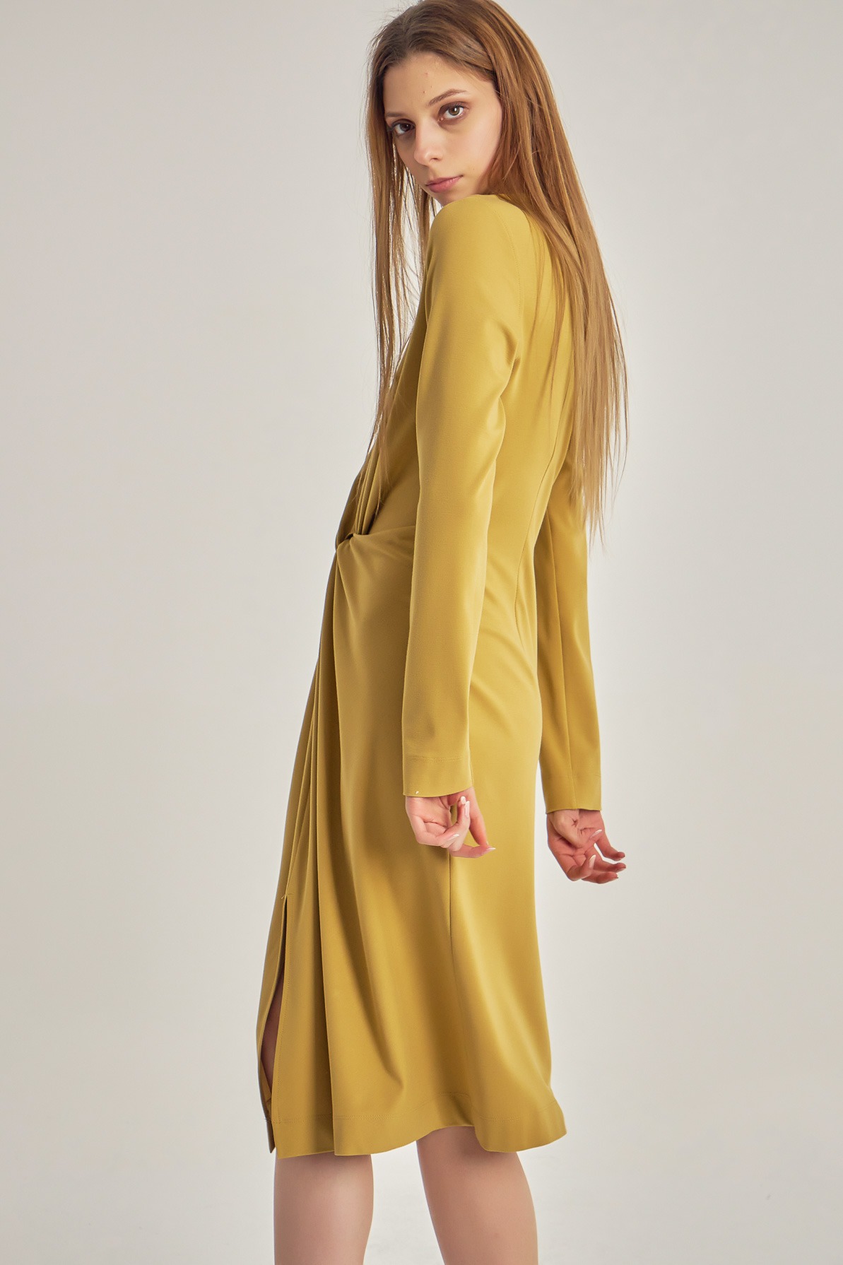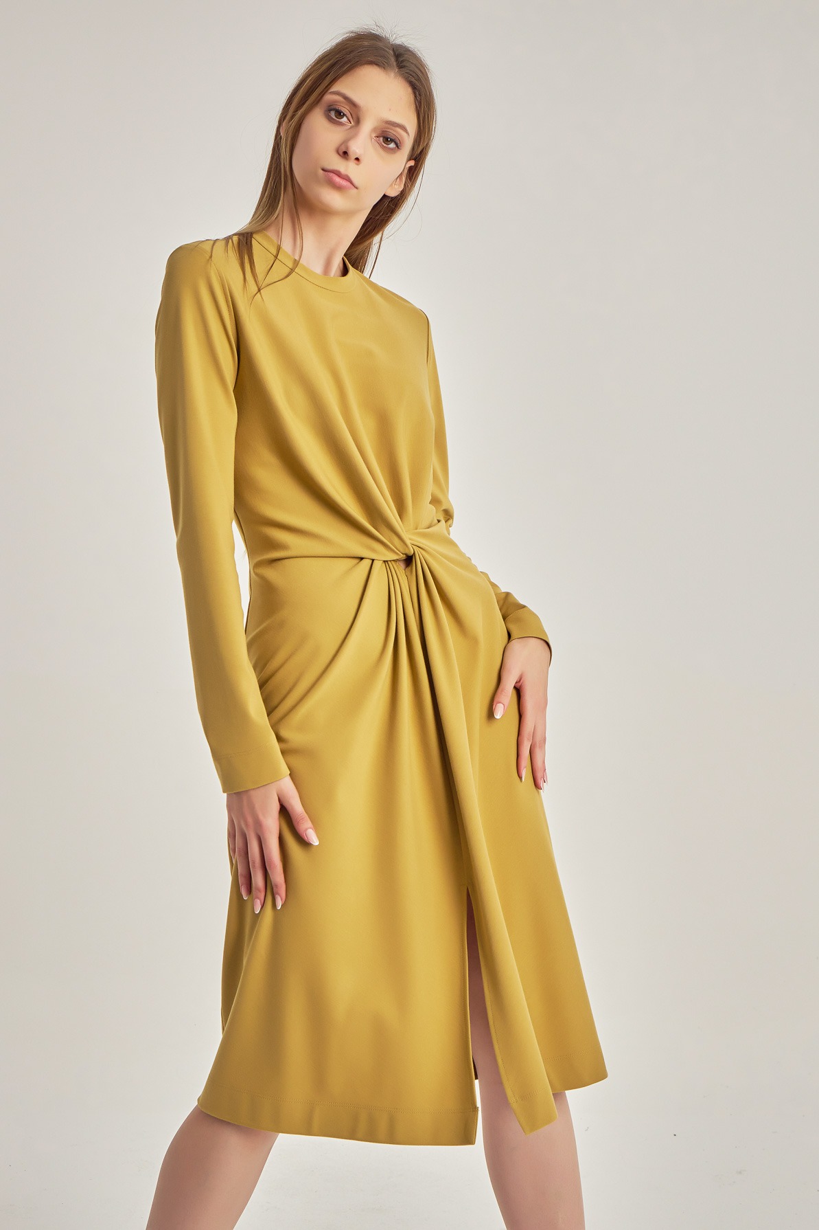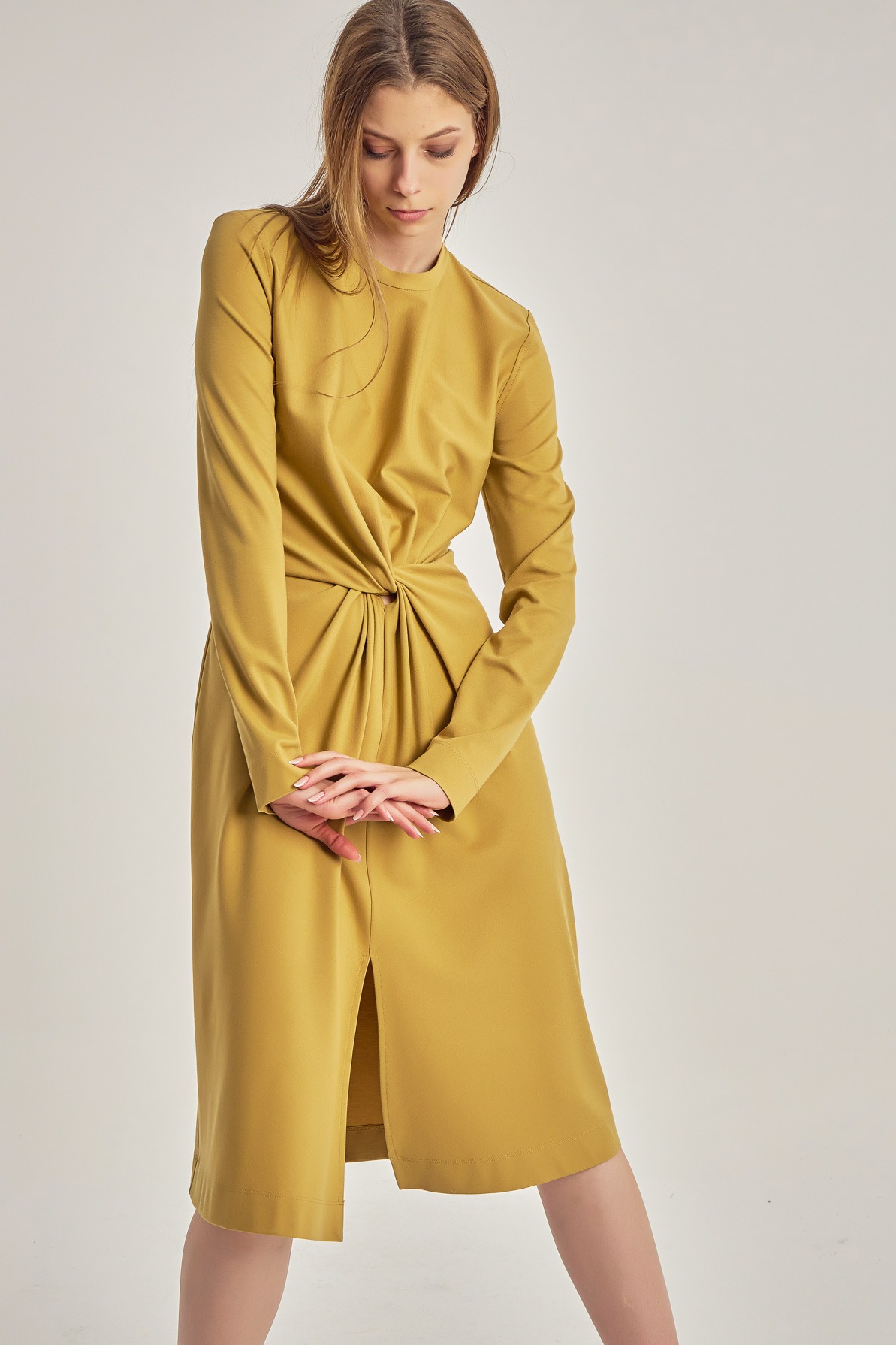 Rochie business-casual, cu mânecă lungă și detaliu tip nod în talie.