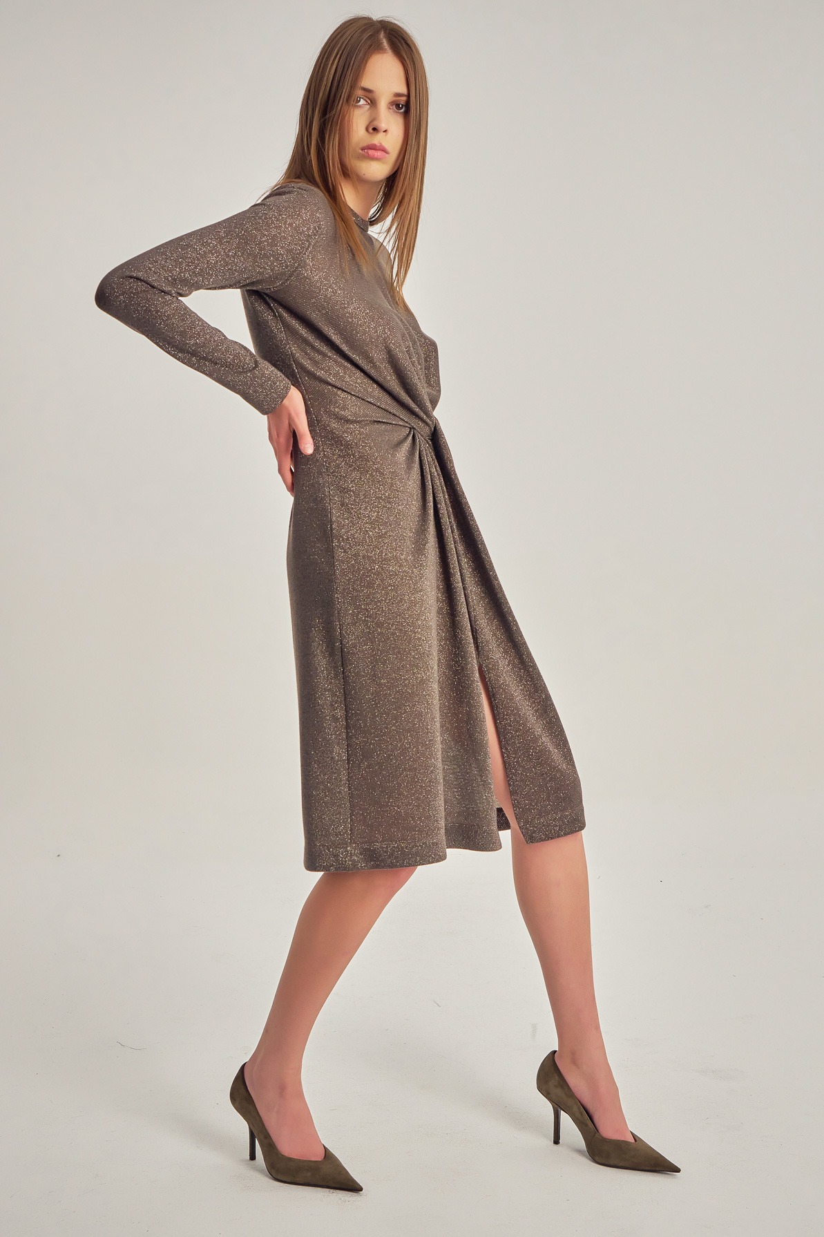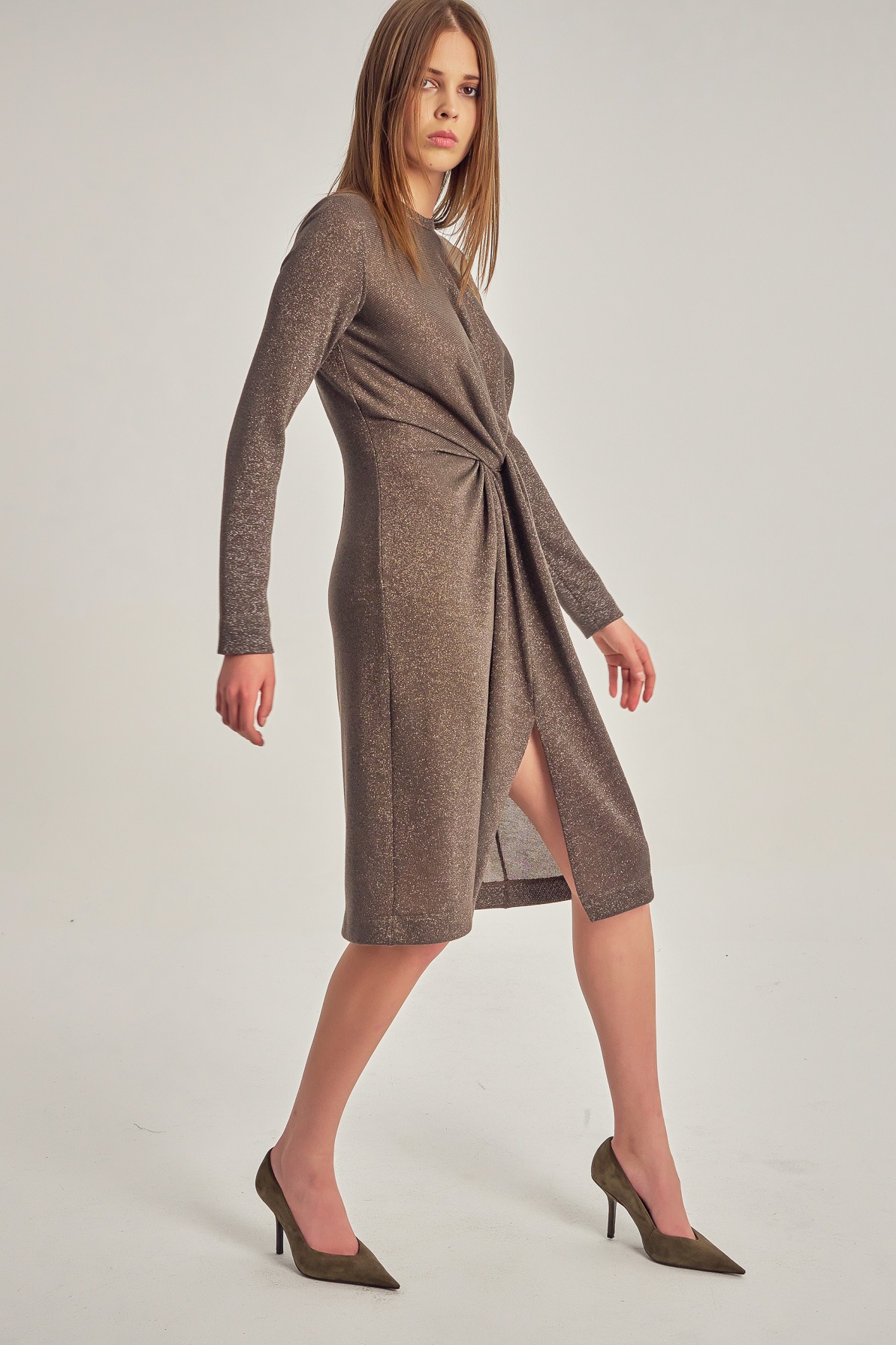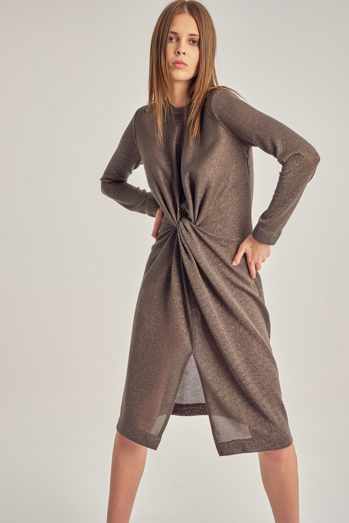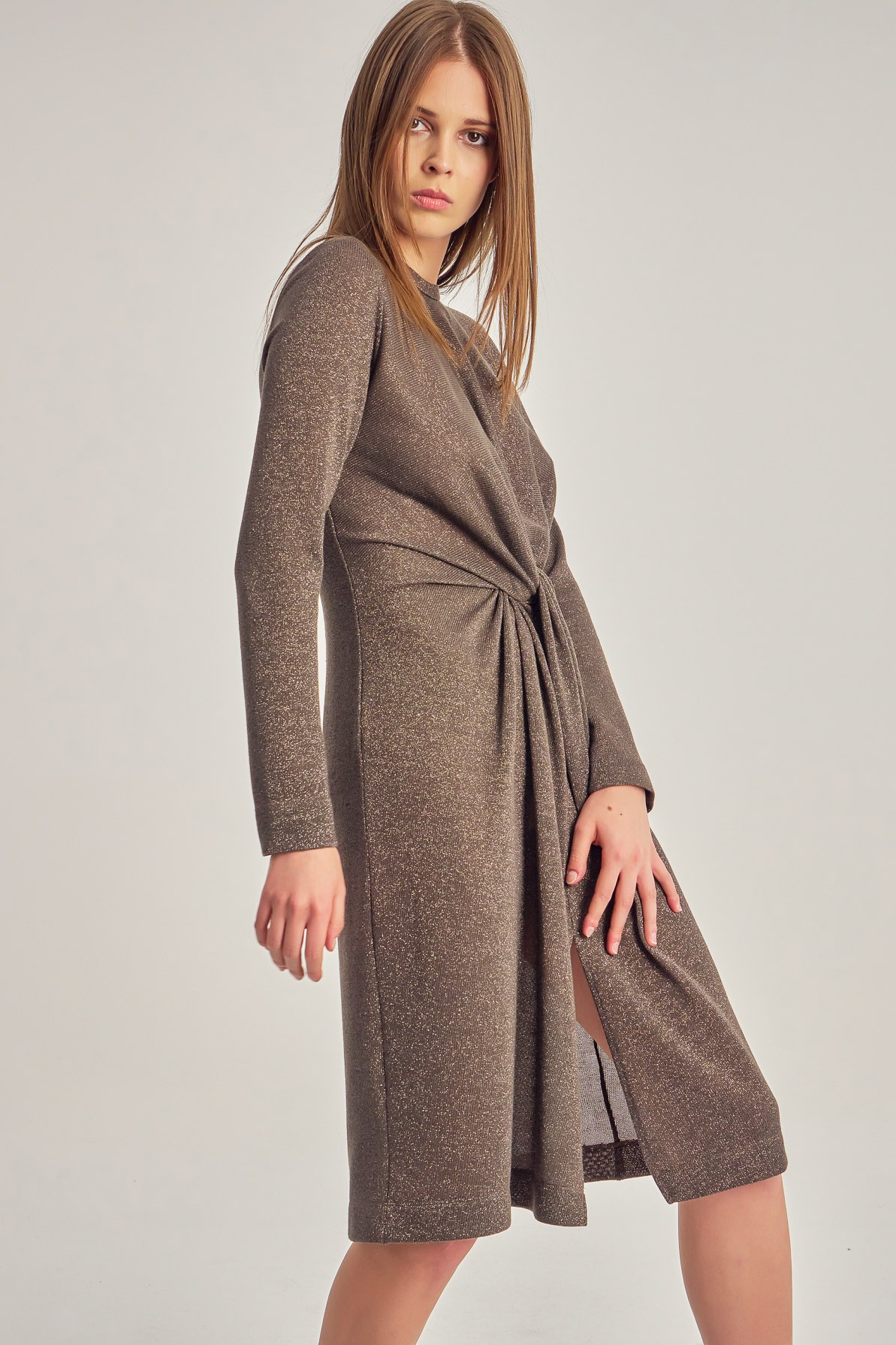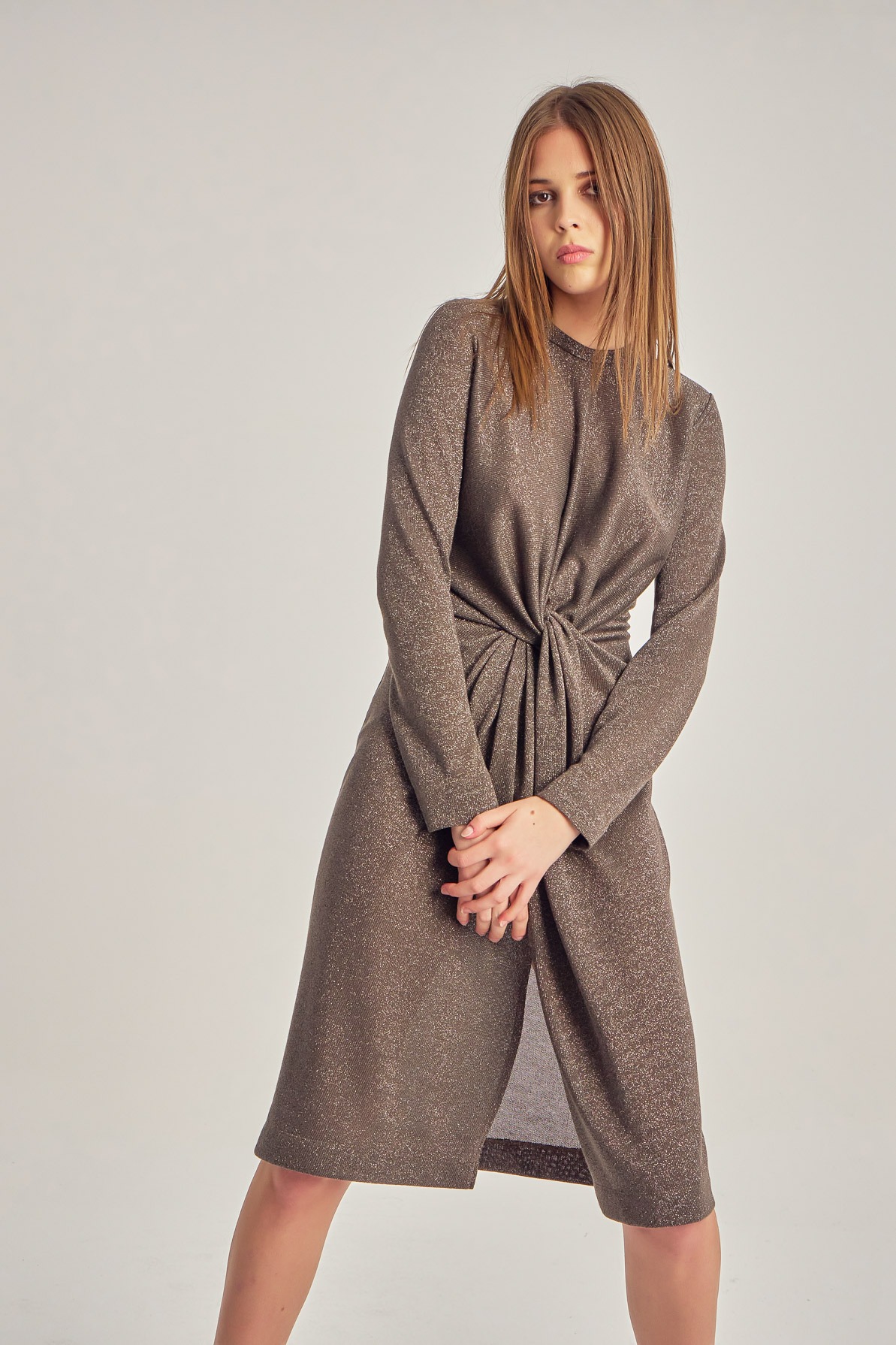 Rochie business-casual, cu mânecă lungă și detaliu tip nod în talie.