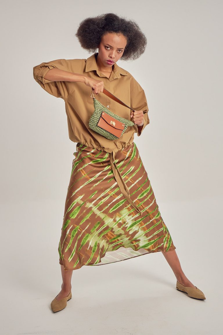 Rochie din crepe de vîscoză cu eșarfă asimetrică detașabilă.