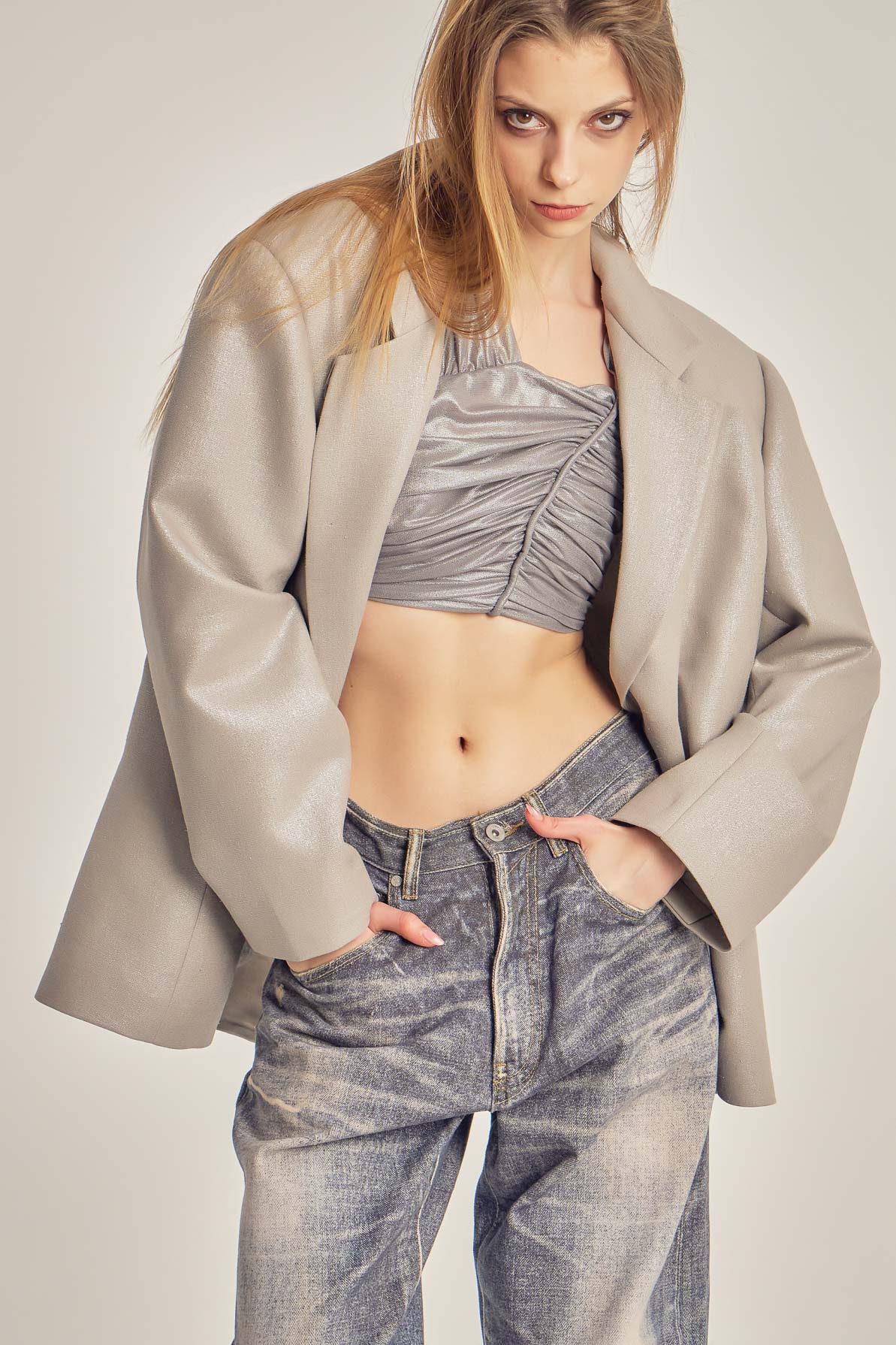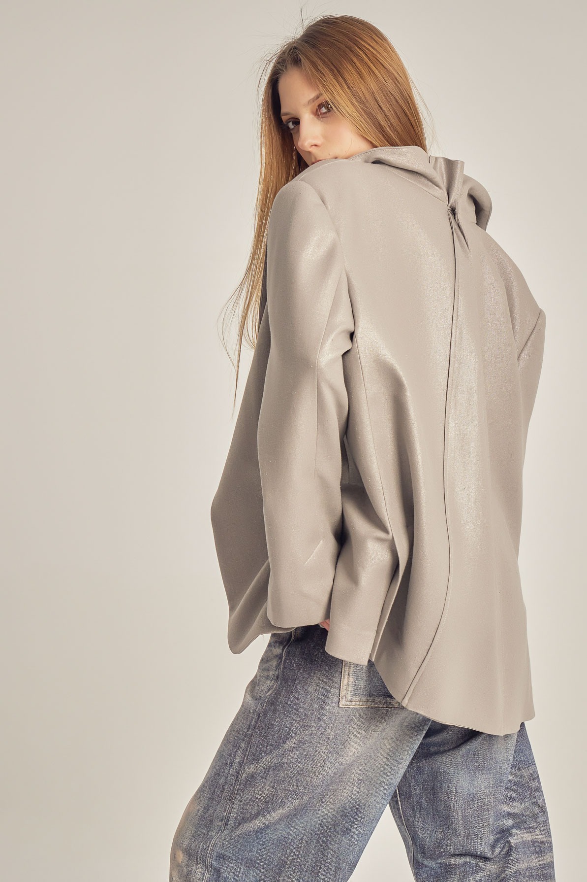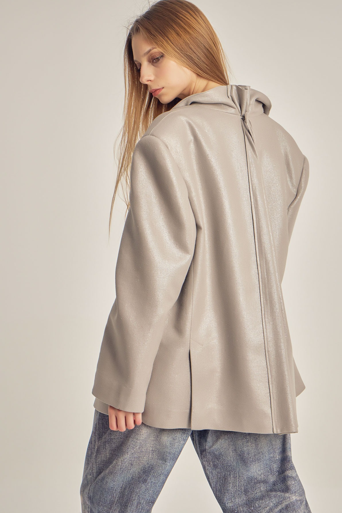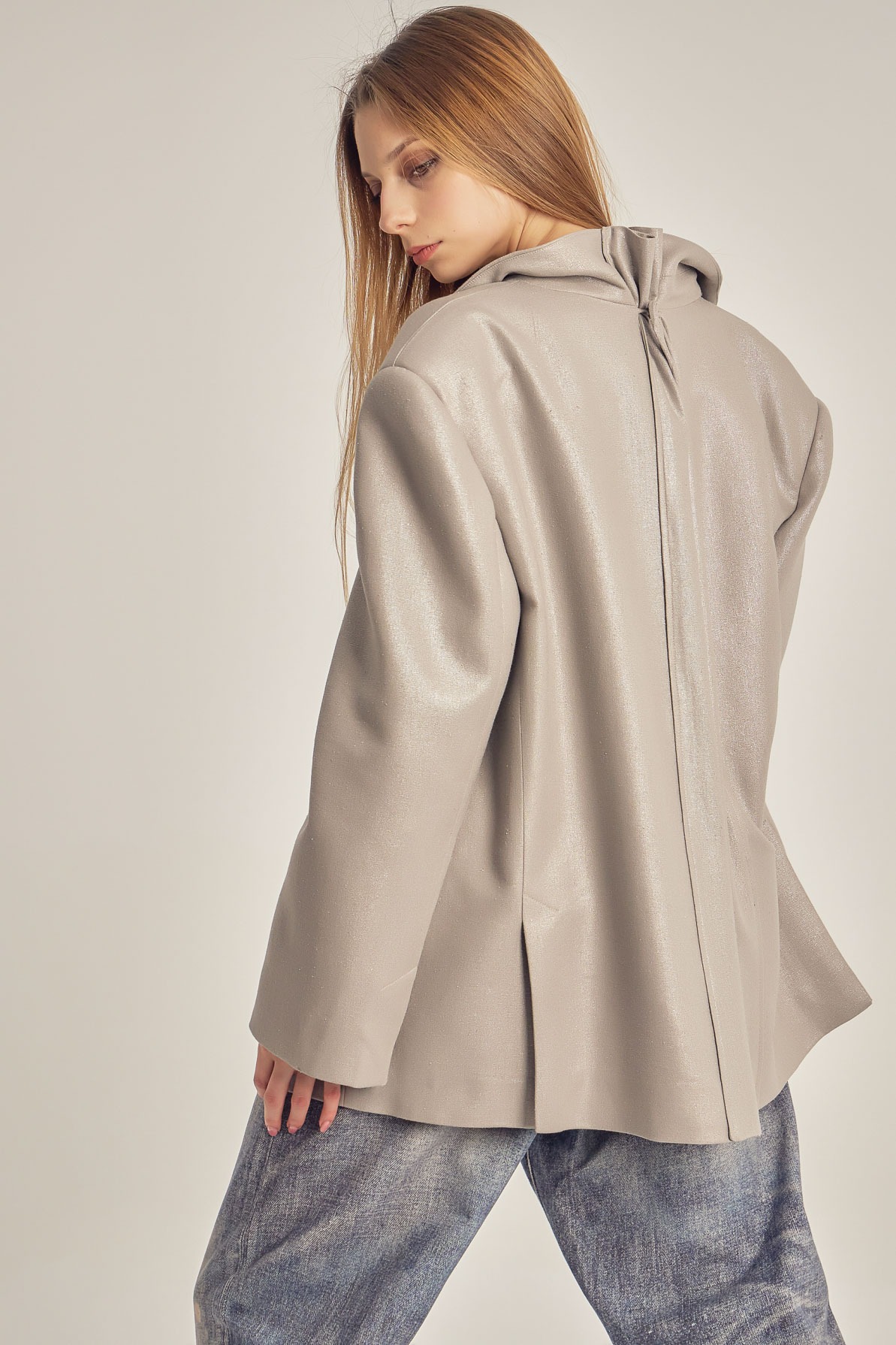 Sacou oversize realizat din in metalizat, cu textură ușor lucioasă și structură lejeră. Croiala amplă și liniile curate îi oferă un aer modern, relaxat, fiind ușor de purtat atât în ținute casual, cât și în combinații mai sofisticate. Un statement subtil, cu finisaj contemporan.