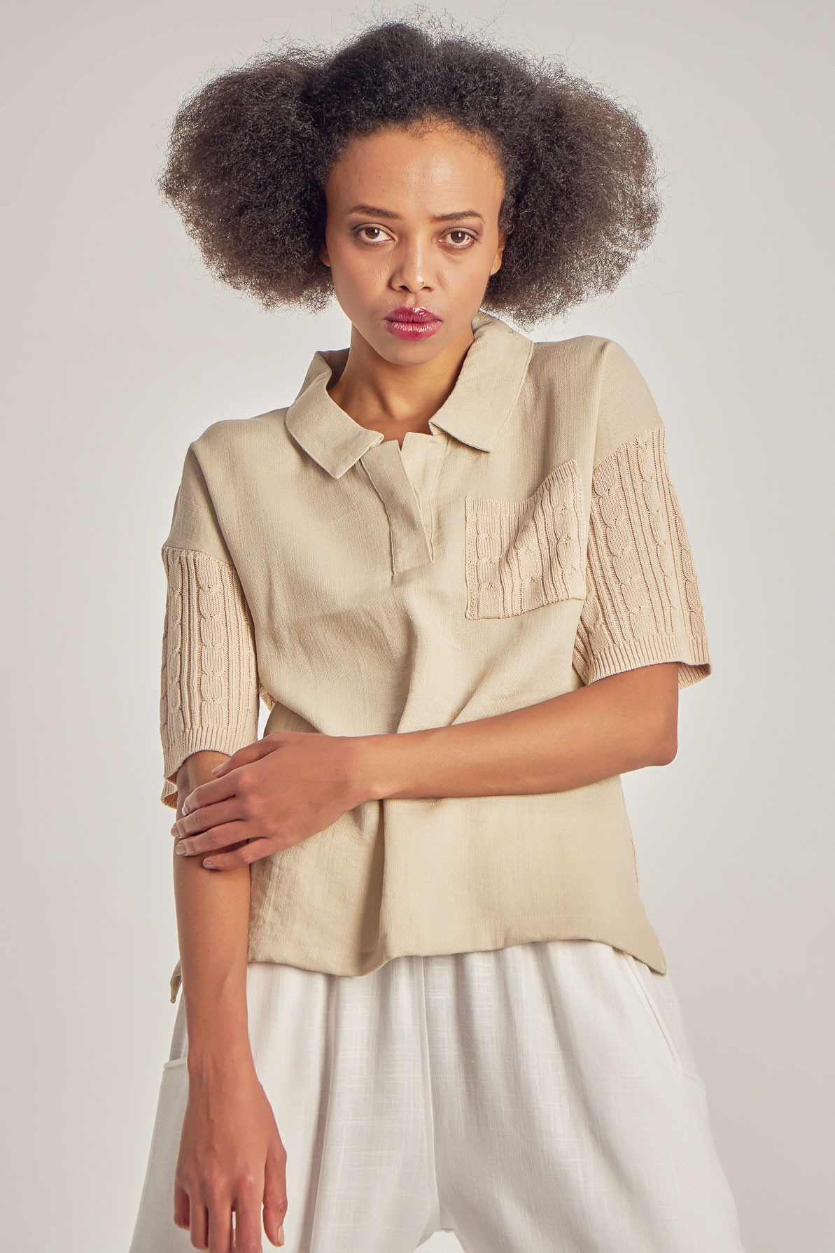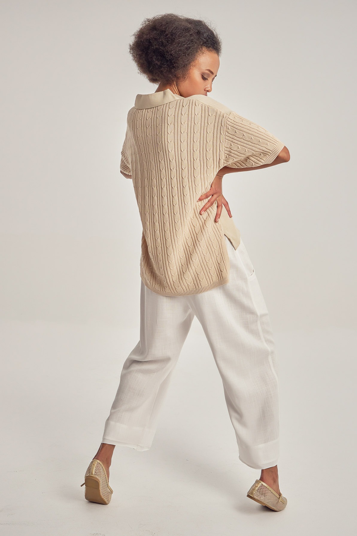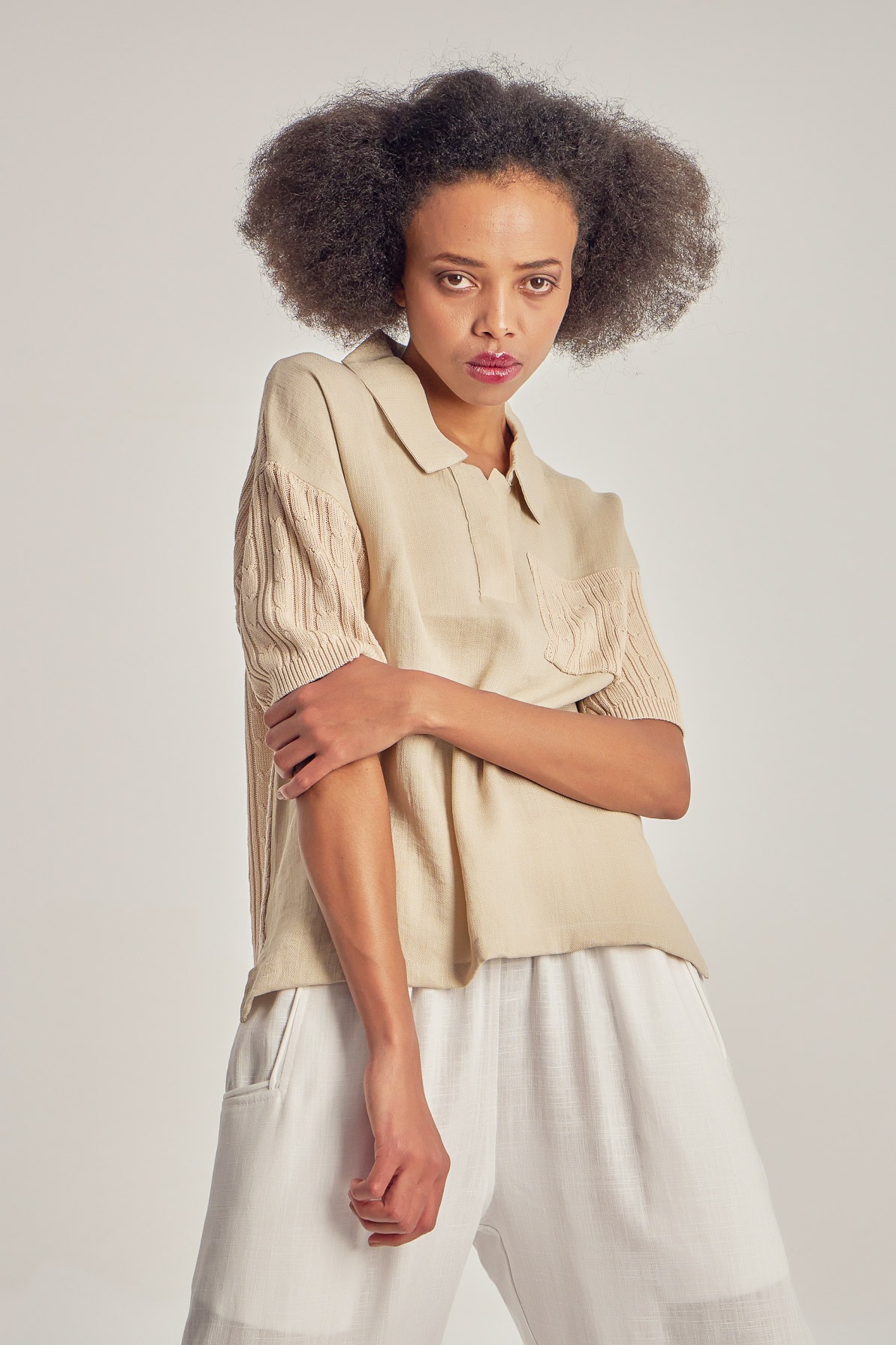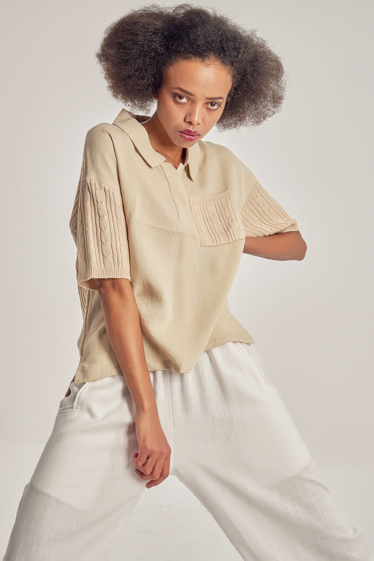 Top lejer cu maneci scurte, din in si jerse cu vascoza.