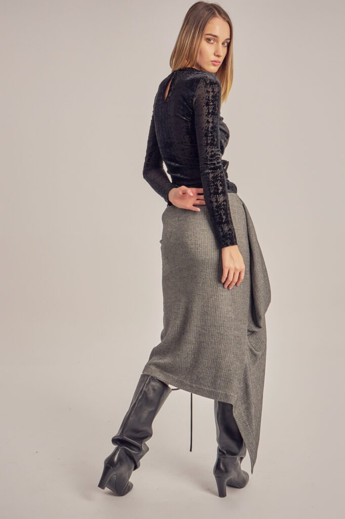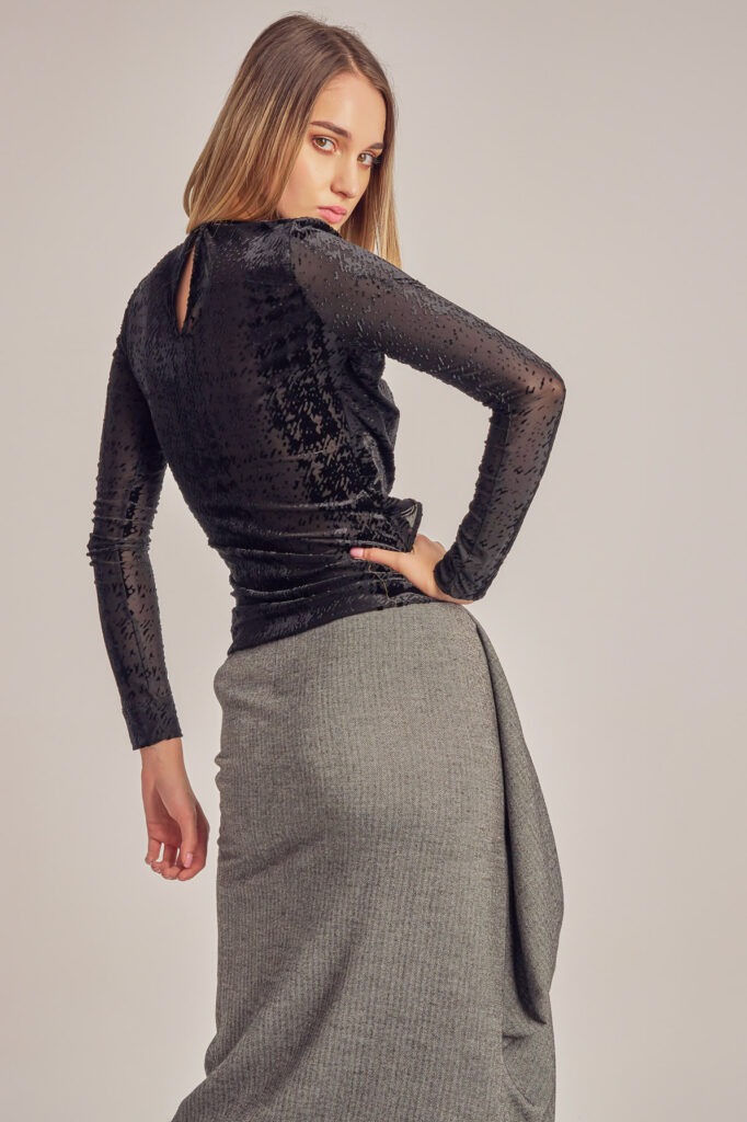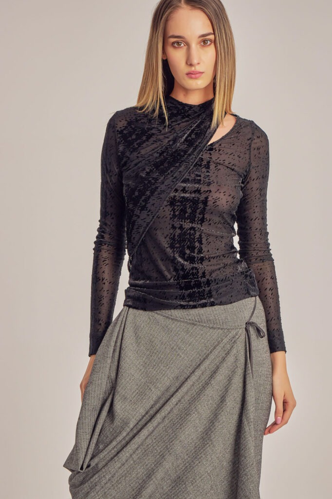 Bluză din catifea elastică devorată, cu mâneci lungi, decupaj drapat pe umăr și un croi tip maletă.